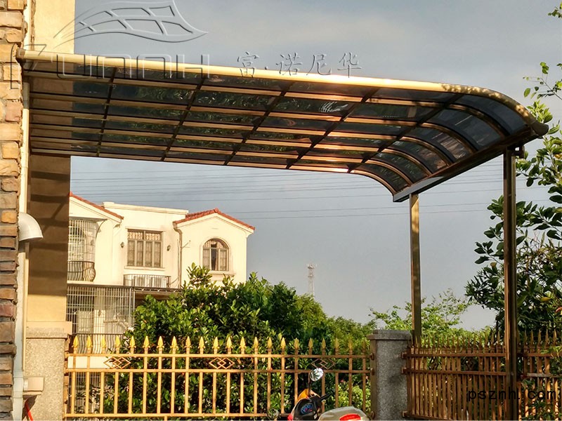5防紫外线、户外遮阳棚挡雨篷产品,还需要考虑紫外线的问题,富诺尼华建材遮阳挡雨棚系列产品,顶板都特殊添加了UV共挤层,防止太阳光紫外线的暴晒,有效防护棚下物品。